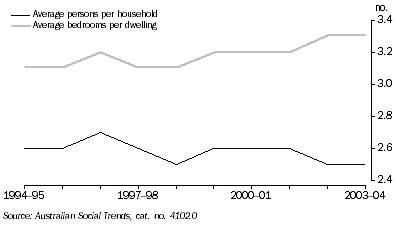Changes in household size and in the average number of bedrooms per dwelling have led to improvements in housing suitability. Western Australians are increasingly living in houses with more bedrooms and fewer people. The average number of bedrooms per dwelling increased from 3.1 in 1994-95 to 3.3 in 2003-04. At the same time, the size of the average household decreased slightly from 2.6 to 2.5 persons. Nationally, the number of bedrooms per dwelling rose from 2.9 to 3.0, and the average household size fell from 2.7 to 2.5 persons over the same period.