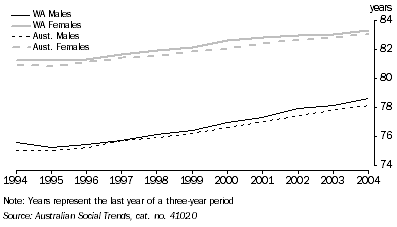 Life expectancy at birth is a measure of how long someone born in a particular year might expect to live if mortality patterns for that year remained unchanged over their lifetime. In Western Australia over the 10 years to 2004, life expectancy rose for both males and females. A boy born in 2004 could expect to live to be 79, while a girl could expect to reach 83 - an increase of 3 years for males and 2 years for females from 1994. This increasing life expectancy can largely be attributed to the promotion of healthier lifestyles, continued improvements in living standards, and ongoing medical advances. As can be seen in the graph below, the life expectancy for Western Australians has been slightly higher than the national average for both males and females in each year since 1994 (with the exception of equal male life expectancy in 1997).