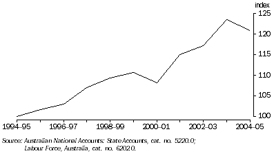 Labour productivity is measured by the ratio of output (Gross State Product) to labour input (hours worked). Over the past decade, Western Australia has experienced improved labour productivity, rising 21% between 1994-95 and 2004-05. This compared to a 22% rise in Australian labour productivity over the same period. These results need to be read with some care, as part of the rise in labour productivity will be due to 'capital deepening' (an increase in the ratio of capital to labour).
