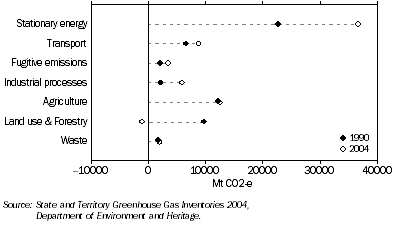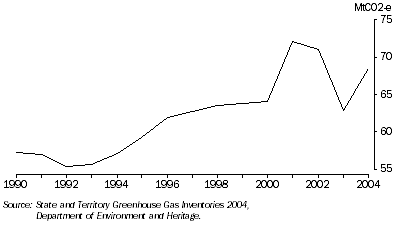 The state's contribution to national greenhouse gas emissions has also grown between 1990 and 2004, increasing from 10% to 12% of Australia's total emissions. Most of this rise has been due to emissions from energy and transport, driven by economic and population growth. Emissions from stationary energy grew by 61% over the period (from 23 to 37 Mt CO2-e), which includes energy consumed by households and energy used for business, manufacturing and commercial purposes.