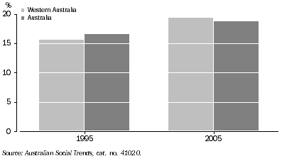 In 2005, lone mother families accounted for 19% (43,000) of all families in Western Australia with children under 15 years of age, an increase from 16% (32,000) in 1995. The proportion of children in lone mother families was marginally higher in Western Australia (19.4%) than nationally (18.7%) in 2005. Ten years earlier it was the reverse with Western Australia (15.6%) having a slightly lower proportion of children in lone mother families than Australia as a whole (16.6%).