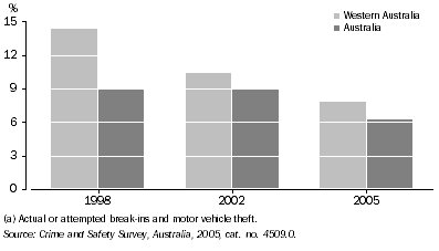 In 1998, 14.3% of households in Western Australia were the victims of at least one household crime. This rate was well above the national average of 9.0% and the highest of all states and territories in Australia. Since 1998, the rate in Western Australia has almost halved to 7.8% in 2005, although it still remained above the national rate of 6.2%. The victimisation rate for break-in or attempted break-in declined from 12.4% to 7.2% of all Western Australian households between 1998 and 2005. Over the same period, the victimisation rate for motor vehicle theft halved from 2.4% to 0.9%.