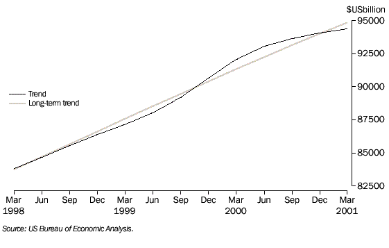 There was a significant turnaround of 0.14 in the contribution of the secured housing finance commitments component to the change in the XCLI between the September quarter 2000 and March quarter 2001, from -0.09 in the September quarter 2000 to 0.05 in the March quarter 2001. Following the weak original GDP data for the December quarter 2000, the growth of the GDP trend was slower over the second half of 2000 but was still positive-from a high of 1.26% in the March quarter 2000 to a low of 0.07% in the December quarter 2000. The growth of the historical long-term trend continued to decelerate and was 0.89% in the December quarter 2000, which is to be expected given the recent decline in GDP trend. THE REFERENCE SERIES, GDP The reference or target series for the XCLI is the GDP business cycle in Australia. The business cycle of a series is defined as the deviation between the trend and the historical long-term trend in the series. Graph 1 shows the business cycles in GDP and the XCLI. Graph 2 shows the level of trend GDP compared with its historical long-term trend. AN ALTERNATIVE REFERENCE SERIES, NON-FARM GDP In the December quarter 1995, there was a peak in the business cycle which the XCLI failed to predict. This peak was largely attributable to the effects of a good farm season. The XCLI does not contain an indicator which leads first order farm product effects. In recognition of this, Graph 3 presents an alternative target series, namely, the business cycle of non-farm GDP, chain volume measure. The XCLI peaked in the March quarter 2000. Based on historical performance, the non-farm GDP business cycle may have been expected to peak two quarters later. However, after revisions of the GDP trend, the non-farm GDP business cycle also peaked in the March quarter 2000. 3. EXPERIMENTAL COMPOSITE LEADING INDICATOR (XCLI) AND, THE BUSINESS CYCLE IN NON-FARM GDP - Chain volume measure (reference year 1998-99)(a) ANALYSIS OF COMPONENT INDICATORS The XCLI summarises the business cycles present in a selection of economic indicators which had typically shown turning points ahead of the business cycle in GDP from the early 1970s to the early 1990s. Because the evolution of each expansion and contraction in activity presents a unique combination of features, none of the individual component indicators has had an unvarying or perfectly stable leading relationship with GDP. However, when combined to form the XCLI their performance as a group is more stable. In the March quarter 2001, four of the eight components made negative contributions to the quarterly change in the XCLI, three components made a positive contribution, while another made a negligible contribution (Table 2 and Graph 4). However, overall the XCLI was still negative although the rate of decline was less than in the previous quarter. Graphs 5 to 12 show each component’s trend and historical long-term trend. Negative contributions. The components making negative contributions to the quarterly change in the March quarter 2001 XCLI were the US GDP (-0.10, Graph 6), production expectations (-0.06, Graph 11), job vacancies (- 0.05, Graph 8), the All Industrials Index (-0.04, Graph 9) while business expectations made a negligible contribution (-0.00, Graph 12). Positive contributions. The components making positive contributions to the quarterly change in the March quarter 2001 XCLI were the trade factor (0.06, Graph 5), housing finance commitments (0.05, Graph 7) and the real interest rate component (0.01, Graph 10). 4. CONTRIBUTIONS TO QUARTERLY CHANGES IN THE XCLI TRADE FACTOR 5. TRADE FACTOR The trade factor is defined as the ratio between commodity prices in terms of Special Drawing Rights and the price index for imported materials used by Australian producers. This ratio gives an early indication of changes in the terms of trade. In the March quarter 2001, the trend of the trade factor continued to decline, although at a slower rate in comparison to its long-term trend. Therefore, given the position of the trend relative to its long-term trend and the trend’s slower negative growth, the trade factor component made a positive contribution (0.06) to the change in the XCLI in the March quarter 2001, the largest positive contribution of all its components. United States GDP In the March quarter 2001, the trend of the United States GDP continued to rise, although at a slower rate since the December quarter 1999. Further, the long-term trend also continued to increase in the March quarter 2001, although the rate of growth has decelerated since the June quarter 1998. The trend of the US GDP crossed below its long-term trend in the March quarter 2001 for the first time since the December quarter 1999. Therefore, the US GDP component made a negative contribution (-0.10) to the change in the XCLI in the March quarter 2001, the largest negative contribution of all its components. 6. UNITED STATES GDP, Chain volume measure (Reference year 1996) Secured housing finance commitments Following four quarters of decline, the trend of the secured housing finance commitments rose in the March quarter 2001. The historical long-term trend for secured housing finance commitments continued to rise in the December quarter 2000 although at a decelerating rate over the last three years. Since the trend grew faster than its long-term trend in the March quarter 2001, the secured housing finance commitments component contributed positively (0.05) to the change in the XCLI in the current quarter, following a neglible contribution in the December quarter 2000 and three strong negative contributions in the previous three quarters. 7. SECURED HOUSING FINANCE COMMITMENTS Job Vacancies Note that the job vacancies series are referenced to the middle month of a quarter. Following downward revisions to the original job vacancies data in May, August and November, the trend of the number of job vacancies was revised. It is now shown as beginning a decline in May 2000, wh