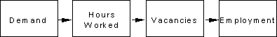 Feature Article - Leading Indicators of Employment FIGURE 1 DRIVERS OF EMPLOYMENT GROWTH When a firm faces increased demand for its product, it may initially increase the hours worked by its employees to service this additional demand. That is, the existing workers are asked to work longer hours. If the firm believes that the increase in demand is long lasting, it may advertise for additional workers to sustain the increased level of output. These vacancies may eventually be filled and total employment will increase. Of course the link between each step is not guaranteed. An increase in demand may result in a firm running down inventories rather than increasing production. Alternatively, increased demand may be met by an increase in the productivity of existing workers rather than an increase in the number of hours worked or the number of workers. METHODS: TURNING POINT AND CORRELATION ANALYSIS Turning point analysis is used to compare the patterns of peaks and troughs in three series-actual hours worked, job vacancies, and GDP-to see which series is the best leading indicator of employment. The lag time between a movement in one series leading a movement in employment is also examined. Turning point analysis involves capturing the business cycle component from each series. This is done by separating the business cycle component from the other time series components, such as the irregular and long-term trend components and comparing the respective peaks and troughs over time. Broadly, this is done by applying different length Henderson moving averages to remove short cycles of less than two years (which produces a trend series) and very long cycles of more than eight years (which produces a long-term trend series). The difference between the trend and the long-term trend is referred to as the business cycle component of the time series. The business cycle component in this article is presented as standard deviations from the long-term trend. A full business cycle represents the movement from peak- trough-peak or from trough-peak-trough. Correlation analysis is a technique which can be used to measure the degree of linear association between two variables. The stronger the linear correlation (i.e. closer to +1 or -1), the closer the association between the two variables. By examining the correlation between the business cycle component of each series, the strength of the relationship can be assessed. The analysis can also examine whether there is correlation with future (or previous) periods. This is often referred to as lead-lag analysis. DATA The monthly employment data are from Labour Force, Australia (cat. no. 6202). The monthly hours worked data are from Labour Force, Australia, Detailed-Electronic Delivery (cat. no. 6291.0.55.001). The quarterly job vacancies series is from Job Vacancies, Australia (cat. no. 6354.0). Quarterly GDP is from Australian National Accounts: National Income, Expenditure and Product (cat. no. 5206.0). EMPLOYMENT GROWTH It is useful to observe employment growth between periods. This makes it easier to observe occasions when employment falls during economic downturns and increases during expansions. Figure 2 shows quarterly percentage changes in the level of employment (trend series) from March 1984 to December 2003. FIGURE 2: QUARTERLY CHANGES IN EMPLOYMENT, TREND Employment increased steadily during the mid to late 1980s. During 1989 employment growth began to slow, ending with the recession of the early 1990s. In 1992 employment growth began to recover. Since this time employment growth has been reasonably steady. However, employment did fall for a brief period in 2000 and 2003. The next section of this article explores the relationship between the three potential leading indicators and employment. All series referred to in the analysis are the business cycle component of the seasonally adjusted series. EMPLOYMENT AND HOURS WORKED A firm facing increased demand for its product may increase the hours worked by its employees to meet the additional demand. Existing workers are only willing (or able) to work a certain amount of additional hours. If demand continues to increase additional workers may have to be employed. Therefore, a rise in the number of hours worked may be a leading indicator of employment. Turning point and correlation analysis was conducted for total employment and the total number of actual hours worked. Figure 3 shows the turning point analysis for the business cycle component of total employment and total hours worked. This provides a visual representation of the turning points for each series. For example, when the business cycle component of employment dips below zero, employment is below the long-term trend. Conversely when the business cycle component of employment is above zero, employment is above the long-term trend. The total actual hours worked series looks broadly similar to the total employment series over the period November 1983 to October 2003. It is of interest to note that the troughs experienced by total employment in March 1996 and February 2000 were not closely matched by the total hours worked. FIGURE 3: BUSINESS CYCLE TURNING POINT ANALYSIS, Total Employment and Total Hours Worked Peaks in total actual hours worked lead peaks in employment by up to one month. However, in most cases peaks in total actual hours worked coincide with peaks in employment. Troughs in total actual hours worked lead troughs in employment by up to two months over the period. The relationship between total actual hours worked and total employment can be difficult to disentangle. A rise in the total number of actual hours worked could be a function of existing employees working longer hours or new employees contributing to the total actual hours worked. This is evident from examining the correlation analysis for the two variables in Figure 4. This tests the strength of the relationship between hours worked in one month and employment in the sub