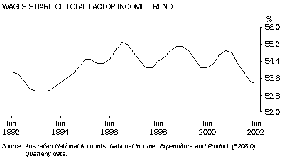The trend ratio of compensation of employees to total factor income (the wages share) was at its lowest point in the last 10 years in the June quarter 1993, when it stood at 53.0%. By December quarter 1996 the ratio had risen to reach 55.3%, its highest level for the 1990s. The ratio in June quarter 2002 was 53.3%. Movements in the trend ratio of gross operating surplus for financial and non-financial corporations to total factor income (the profits share) tend to be inverse to the movements in the wages share as wages and corporate profits are the two major components of total factor income. The profits share recorded its highest value during the last 10 years of 24% in the September and December quarters 1993, and in the June quarter 2002.