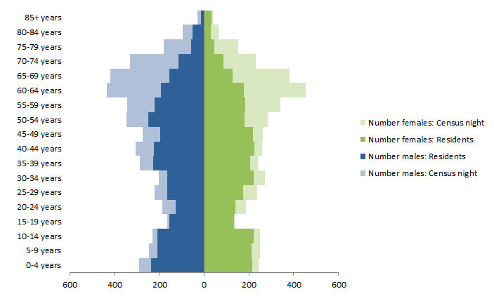 HIGH CENSUS NIGHT RATIOS, WESTERN AUSTRALIA: CARNAVON CENSUS NIGHT AND USUAL RESIDENT POPULATIONS, by Age and Sex, Carnavon, Western Australia, 2011