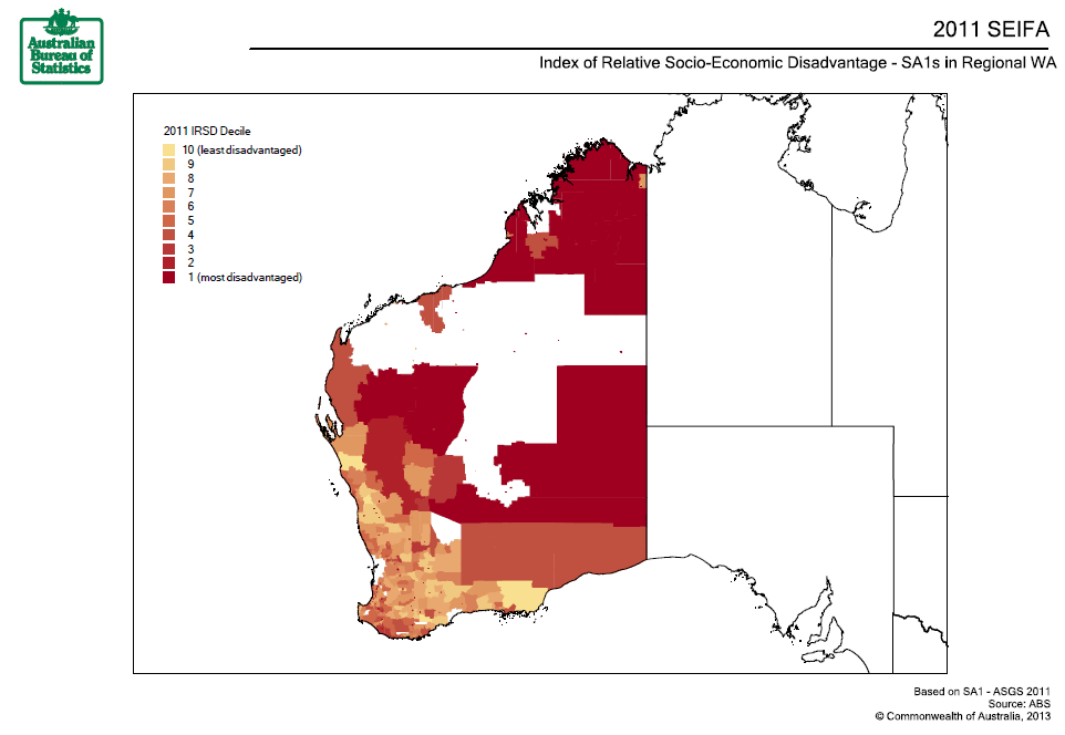 Below are example maps that illustrate the benefits of mapping SEIFA, showing the spatial distribution of advantage and disadvantage.