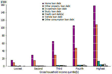CONTENTS - Introduction - How common is household debt? - Do the wealthiest households carry the least debt? - Are low income households heavily in debt? - Relationship between employment and debt - Do we borrow when young and repay before retirement? - How long do households stay heavily in debt? - Conclusion EXPLANATORY INFORMATION - Data sources and definitions - Endnotes Related terms home loan debt, investment debt, credit card debt, debt free, income, wealth, high income, low income INTRODUCTION Like income and wealth,1 debt isn't distributed evenly among Australian households. Some households have high levels of debt while others have no debt whatsoever. A high level of debt could be difficult to manage for some households with few assets and little income. On the other hand, high levels of debt held by some wealthy, high income households could reflect their desire and ability to use debt to acquire wealth faster than would have been possible if they hadn't borrowed. Being debt free does not necessarily indicate financial wellbeing. While some households might relish the opportunity for more discretionary spending after their debts have been fully repaid, the debt-free status of some other households could reflect their inability to borrow money because lenders assess them as not being creditworthy. Such households may fail to qualify for a credit card let alone a home loan, with the 'great Australian dream' of home ownership seeming unattainable. This article uses ABS Survey of Income and Housing (SIH) data to compare average levels of selected forms of debt held by various types of households in 2011-12. For analysis of how the overall level of household debt has changed over recent decades, see the companion article Trends in household debt. For information about how the different types of debt held by households have changed over time, see the companion article What types of debts do households have?. HOW COMMON IS HOUSEHOLD DEBT? Between 2003-04 and 2011-12, more than 70% of Australian households had some type of debt such as a home loan, money owing on a credit card, vehicle finance, overdue bills or business debt. While Australian households are generally not strangers to debt, they're very unlikely to owe more than they own (only 1% did between 2003-04 and 2011-12). DO THE WEALTHIEST HOUSEHOLDS CARRY THE LEAST DEBT? Wealth can give a household the ability to acquire and manage debt. In 2011-12, the average wealth of households in the 20% of households with the least wealth was $31,000. This was much lower than in other household quintiles. The average wealth in the next (second) quintile was $191,000, six times higher than in the lowest quintile. At the other end of the scale, the average wealth of households in the highest wealth quintile was $2,215,000.2 Levels of study loan debt and consumption debt (i.e. credit card debt, vehicle loan debt and other consumption loan debt) varied little between household wealth quintiles in 2011-12. In contrast, households in the lowest wealth quintile tended to have little home loan debt, other property loan debt and investment loan debt whereas households in the highest wealth quintile tended to carry a substantial amount of such investment related debt. AVERAGE LEVELS OF SELECTED TYPES OF HOUSEHOLD DEBT BY WEALTH, 2011-12 (a) Households with a credit card net credit balance have contributed to the calculation of this average. (b) For the value of average wealth in each quintile see Data sources and definitions. Source: Household Wealth and Wealth Distribution, Australia, 2011-12 (ABS cat. no. 6554.0) In 2011-12, only 4% of households in the lowest household wealth quintile owned their home with a mortgage, which largely explains the relatively low average level of home loan debt among these households at that time ($11,200). The proportion of households who owned their home with a mortgage was considerably higher among wealthier households, ranging from 36% in the highest household wealth quintile to 53% in the third quintile.2 For other social, economic and demographic characteristics of households in the five household wealth quintiles, see Household Wealth and Wealth Distribution, Australia, 2011-12 (ABS cat.no. 6554.0). ARE LOW INCOME HOUSEHOLDS HEAVILY IN DEBT? A household's ability to borrow money depends to a large extent on its ability to repay the debt by either selling assets or generating sufficient income to make required debt repayments. In 2011-12, there was a stronger relationship between income (gross household income) and home loan debt than there was between wealth and home loan debt. For each type of household debt collected in the ABS Survey of Income and Housing, the higher a household's income the more it tended to owe. In 2011-12, the average household income of households in the lowest quintile was $393 per week. This was half that of the second quintile ($857 per week) and less than one tenth of the average income of those in the highest quintile ($4,297 per week).2 AVERAGE LEVELS OF SELECTED TYPES OF HOUSEHOLD DEBT BY INCOME, 2011-12 (a) Households with a credit card net credit balance have contributed to the calculation of this average. (b) For the value of average gross household income in each quintile see Data sources and definitions. Source: Household Wealth and Wealth Distribution, Australia, 2011-12 (ABS cat. no. 6554.0) Income can be received from a wide range of sources, such as wages, salaries, dividends, rent, interest, and government pensions and allowances. In 2011-12, the main source of household income for nearly two-thirds of Australian households was income from employment (i.e. wages, salaries or own unincorporated business income).1 These households tended to have higher debt levels than other households. Households whose main source of household income was income support payments from government had particularly low levels of debt. AVERAGE LEVELS OF SELECTED TYPES OF HOUSEHOLD DEBT BY MA