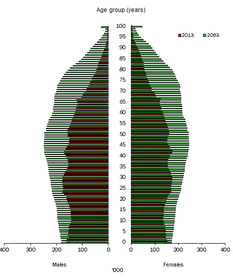 Population pyramids are used to show the extent of each change, overlaying the 2013 estimated resident population with each projected population. Ultimately, the size and shape of our population reflects over 100 years of births, deaths and migration, influenced by major policy and social changes, two world wars, significant improvements in public health, and the advent of widely available, effective contraception. Therefore, regardless of whether higher or lower assumptions are applied to the population over the next 20 and 50 years, much of the impact of these cumulative longer term historical changes will still be visible in the shape and size of the resulting projected populations.