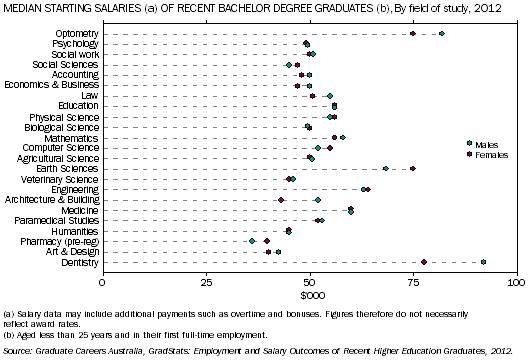 COMMENTARY MEDIAN STARTING SALARY OF RECENT BACHELOR DEGREE GRADUATES In 2012, the median starting salary for recent female graduates, aged less than 25 years and in their first full-time employment, was $50,000. The median starting salary for recent male graduates was $55,000. Information about the earnings of recent university graduates provides a perspective on immediate financial outcomes of higher education. (Endnote 1) The differences in overall median starting salaries between males and females can be partly explained in terms of the differing enrolment profiles of males and females. However, there are many other factors that can influence starting salary differences. While males and females may have studied in the same field, differing employment factors such as occupation, type and location of the employer, or the hours worked, can also have an impact on the earnings. (Endnote 2) Data on graduate earnings are collected as part of an annual survey (Australian Graduate Survey (AGS)) conducted by Graduate Careers Australia (GCA). The survey gathers data on the employment and further study outcomes of graduates who completed their study in a given year. The median starting salary for male and female recent Bachelor Degree graduates in 2012 was $55,000 and $50,000 respectively. After adjusting salary data for changes in the Consumer Price Index, this represents a change of 13% for male graduates and 8% for female graduates since 2003. To be included in the AGS, respondents need to be an Australian citizen or permanent resident aged under 25, and have completed a bachelor degree or three-year undergraduate diploma. Respondents must have identified secondary school as their highest previous education qualification, and have provided valid data regarding their salary, sex, field of education and level of award in the survey. Data are collected approximately four months after the completion of their respective course of study. The graduates are surveyed in two cohorts, those who complete their study in the first half of the year are surveyed as at 30 October, and those who completed their study in the second half of the year are surveyed as at 30 April in the following year. The salary data for a given year reflect the data for that whole financial year (i.e. 2012 salary data reflect 2011-12 salaries of new graduates as collected in October 2011 and April 2012). The 2012 AGS collected information on the salaries of 12,759 graduates. Males comprised 38.5% (or 4,911) and females comprised 61.5% (or 7,848) of this sample. Over the past ten years, the total AGS graduate salary sample has ranged between 12,343 and 15,062 graduates. The number of male graduate salary sample over the past ten years has ranged between 4,243 and 5,461, and between 7,848 and 9,601 for the female graduate salary sample. 2012 data for this commentary have been sourced from the AGS preliminary report, and provide indicative differences between the starting salaries of men an women. (Endnote 2) A subsequent report which provides statistical analysis on 2012 data (including significance testing for differences in salaries) is expected to be released later in 2013 on the GCA website (see Endnote 3 for the reports featuring 2010 and 2011 data). Median starting salary by field of study Analysis of differences between median starting salaries for male and female graduates should be performed with caution, as some fields of study (e.g. Optometry, Dentistry, Earth Sciences) tend to have low response numbers, and the difference obtained from the AGS may not actually exist for the overall graduate population. Further statistical analysis on 2012 data is expected in the subsequent AGS report to be released later in 2013. However, for 2012 salary data, some fields of study are likely to continue to provide significant gender differences in graduate salaries (based 2010 and 2011 analysis of AGS salary data by GCA) (Endnote 3). Such fields include Architecture and Building ($52,000 for males and $43,000 for females in 2012), Law ($55,000 for males and $50,700 for females), Economics and Business ($50,000 for males and $47,000 for females), and Paramedical Studies ($53,000 for males and $52,000 for females). ENDNOTES 1. Australian Bureau of Statistics, 2002, Education and Training Indicators, Australia, 2002 (cat. no. 4230.0) <www.abs.gov.au>. 2. Graduate Careers Australia, 2012, GradStats: Employment and Salary Outcomes of Recent Higher Education Graduates, 2012, GCA, Melbourne <www.graduatecareers.com.au>. 3. Graduate Careers Australia, 2012, Graduate Salaries: A Report on the Earnings of New Australian Graduates in their First Full-Time Employment, 2010 and 2011, GCA, Melbourne <www.graduatecareers.com.au> EDUCATION LINKS Glossary Data Cubes Document Selection These documents will be presented in a new window.