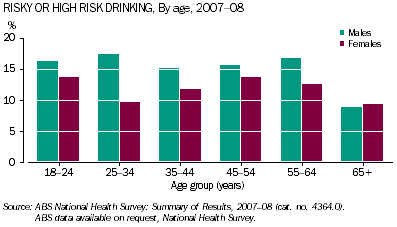 COMMENTARY CONSUMPTION OF ALCOHOL In 2007-08, a higher proportion of men aged 18 years and over consumed alcohol in quantities at a risk or high risk to their long-term health, compared to women (15% compared to 12%, standardised for the age structure of the population). Excessive alcohol consumption is one of the more prominent health risks in modern Australian society. It is associated with risks to health both in the short and long term, including mood and anxiety problems and chronic conditions caused by injury. It may also affect a person’s ability to work, or participate in other aspects of family and community life. (Endnote 1) Excessive alcohol consumption affects society as a result of property damage, road accidents and the need for law enforcement. In 2008 the estimated annual cost to Australia’s health care system from drinking was $15 billion. (Endnote 2) Between 1995-96 and 2005-06, around 813,000 Australians were hospitalised for injury or disease attributable to alcohol. In the 10 years to 2005, around 32,700 Australians aged 15 years and over died from causes attributable to risky or high risk drinking. (Endnote 3) For males, 'risky' levels of alcohol consumption constitute more than four standard drinks per day. For females, risky levels constitute more than two drinks per day. 'Risky' levels of alcohol consumption are defined in the National Health Surveys and the National Aboriginal and Torres Strait Islander Social Surveys as those people who consume quantities of alcohol 'at risk' or 'high risk' to their health in the long-term. Alcohol consumption risk levels in the long-term were derived from the average daily consumption of alcohol by persons aged 15 years and over for 3 days of the week prior to interview, and are grouped into relative risk levels as defined by the National Health and Medical Research Council (NHMRC) in 2001. Since 2009, new guidelines have been introduced. (Endnote 4) By age The proportion who drink alcohol at risky levels varied across the life-cycle, however the proportion of women who drink at risky levels is lower than men in all age groups to 65 years and over. The low rate of risky drinking in the 25-34 year age group for women aligns with prime childbearing years for females, and suggests a conscious curtailing of risk-taking behaviour during this life stage. (Endnote 1) In addition to the risky levels of alcohol consumption is the more risky behaviour of 'binge drinking'. This was more common in younger age groups. In 2005-06, 15-19 year old males and females had the highest hospital separation rates for acute intoxication from alcohol of any age group (124 and 126 per 100,000 respectively). Men and women aged 20-24 years of age had the next highest rates (89 and 74 per 100,000 respectively). (Endnote 5) Over time Between 2001 and 2007-08, there was a small, but significant increase in the incidence of males and females consuming alcohol at risky levels when standardising for the age structure of the population. These increases largely took place between 2001 and 2004-05 (up 2.1 percentage points for males, and up 3.2 percentage points for females). Rates observed in 2004-05 and 2007-08 were similar for both males and females. For females, particularly significant increases occurred between 2001 and 2007-08 for the age groups of 18-24 years and 55-64 years (up 5.1 percentage points and 4.2 percentage points respectively). In contrast, incidences were relatively similar in 2001 and 2007-08 for females in their prime childbearing years (25-34 year olds), as well as those aged 35-44 years old. Males in the 25-34 year age group were the only male cohort where the incidence of risky alcohol consumption increased significantly (from 14% to 17%) over this time period. Aboriginal and Torres Strait Islander peoples In 2008, the incidence of risky alcohol consumption by Aboriginal and Torres Strait Islander peoples was higher than the total population for both males (21%) and females (14%). The difference between Indigenous men and women changed little between 2002 and 2008 with men having a high rate of risky alcohol consumption than women across the life cycle. Among the Aboriginal and Torres Strait Islander population there is a strong link between alcohol consumption and representation in the criminal justice system, particularly for men. (Endnote 6) Aboriginal and Torres Strait Islander men who were chronic risky/ high risk drinkers were two and a half times more likely than women drinkers to be arrested, twice as likely to be charged by police and nearly five times as likely to have been incarcerated. (Endnote 7) In 2002, alcohol consumption was similar between Indigenous men and women for all age groups except for the 45-54 and 55 years and over age groups, where it was significantly higher for males. By 2008, the incidence of risky alcohol consumption by 35-44 year old Indigenous males was also significantly higher than Indigenous females in this age group. Between 2002 and 2008, 18-24 year old Indigenous males were the only age group where the incidence of risky alcohol consumption significantly increased (from 16% to 27%). Endnotes 1. Australian Bureau of Statistics, Australian Social Trends, ‘Smoking, risky drinking and obesity’, 10/12/2009 (cat. no. 4102.0) ABS, <www.abs.gov.au>. 2. Preventative Health Taskforce, 2008, Technical Report No 3: Preventing alcohol-related harm in Australia: a window of opportunity, p. 2. As cited in Australian Bureau of Statistics, Australian Social Trends, ‘Smoking, risky drinking and obesity’, 10/12/2009 (cat. no. 4102.0) ABS, <www.abs.gov.au>. 3. National Drug Research Institute, 2009, National Alcohol Indicators: Bulletin 12: Trends in estimated alcohol-attributable deaths and hospitalisations in Australia, 1996-2005, Australian Government Department of Health and ageing, p. 1. As cited in Australian Bureau of Statistics, Australian Social Trends, ‘Smoking, risky drinking and obesity’,