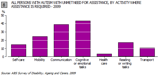 The question arises whether people with autism were receiving as much assistance as they needed. In 2009, many people with autism did not. The need for more assistance in the core activities of mobility, communication and self-care are particularly noteworthy (see Graph 8).