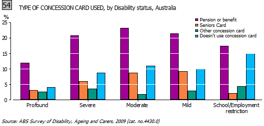Transport for people with disabilities can be made more affordable when they have access to a concession card. Of the 1.5 million people with disabilities who use public transport, just over 460,000 (12%) do not use a concession card. Of those who did use a concession card, the most common card used is a pension or benefit concession card (18%), with a seniors card the next most common (7%) (Graph 54). |