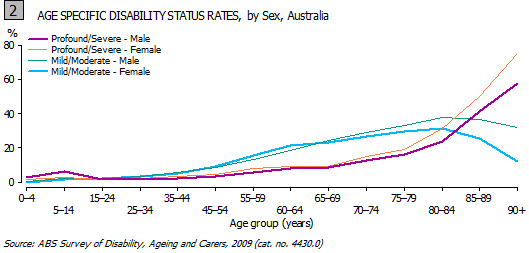 As people grow older, there is an increased tendency to develop conditions that cause disability. This strong relationship between age and disability is evident in that younger people are less likely to report disability than older people. Of those aged 4 years and under, 3.4% were affected by disability, compared with 40% of those aged 65-69 years and 88% of those aged 90 years and over. While the prevalence of disability amongst the Australian population declined 1.5 percentage points, the decrease is particularly noticeable in the younger age groups. Between 2003 and 2009, the disability rate for 15-24 year olds fell from 9.0% to 6.6%. Over the same period the rate of disability also decreased for those aged 25-34 from 11% to 8.6%. Similarly, 22% of 45-54 year olds reported a disability in 2003, compared with 18% in 2009 (Graph 1).