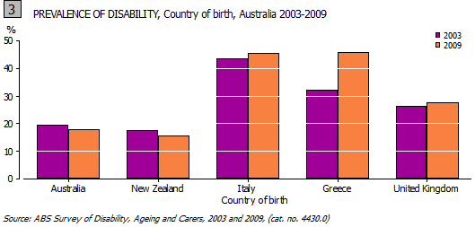 Disability varies by birthplace or immigrant group. There was a decline in the proportion of people with disability in the population who were born in Australia or New Zealand, while disability rates for those born in South Eastern Europe have increased since 2003. This reflects the older age profile of the immigrant population from South Eastern Europe. Since age and disability are correlates, sub-populations in Australia with older median ages (such as those born in South Eastern Europe) can be expected to show higher rates of disability (Graph 3).