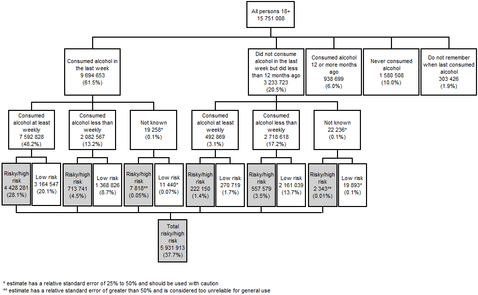 In order to estimate levels of alcohol consumption, respondents in the 2007-08 National Health Survey (NHS) were asked about their alcohol consumption in the last week and over the last 12 months. See the National Health Survey: Data Reference Package, 2007–08 (cat. no. 4363.0.55.002) for a copy of the questionnaire used, as well as the National Health Survey: Users' Guide, 2007-08 (cat. no. 4363.0.55.001) for more information. CALCULATING LONGER TERM RISK ACCORDING TO THE 2001 GUIDELINES To measure risk in the longer term according to the 2001 National Health and Medical Research Council (NHMRC) guidelines, the NHS asks questions about how recently a person had consumed alcohol, and how frequently in the last 12 months. If they had consumed alcohol in the last week, they were then asked on which days of the week they had consumed alcohol. These respondents were asked further, detailed questions about the alcoholic beverages they had consumed on each of the 3 most recent days on which they had consumed alcohol. This information was used to calculate their average consumption over those 1–3 days, from which their average daily alcohol consumption over the last week (in standard drinks) was estimated. It should be noted that in this series of questions, respondents were not asked about standard drinks; rather, they were asked about the type, brand, number and serving sizes of the beverages they consumed, from which the number of standard drinks was derived. Using the estimated average daily alcohol consumption over the last week, respondents were grouped into three categories of relative risk level: low, risky or high risk, based on the 2001 NHMRC guidelines for minimising risk in the longer term. Individuals whose consumption placed them in the risky and high risk categories had exceeded the recommended guidelines. Diagram 1 illustrates how respondents were grouped into categories of longer term risk based on the 2001 guidelines. DIAGRAM 1: CALCULATING LONGER TERM RISK ACCORDING TO 2001 GUIDELINES According to the 2001 guidelines, in 2007-08 there were 2.1 million persons (13.4% of persons aged 18 years or over) who consumed alcohol at risky or high risk levels in the longer term, based on consumption of alcohol in the last week. A further 492,900 people (3.1%) who did not consume alcohol in the last week, normally consumed alcohol on a weekly basis. It is possible that a proportion of these also consumed alcohol at risky or high risk levels. Likewise there were 2.7 million people (17.2%) who, while they did not consume alcohol in the last week, normally consumed alcohol but on a less than weekly basis during the last year. It is also possible that a proportion of these people consumed alcohol at risky or high risk levels. At the same time, there were 1.6 million people (10.0%) who had never consumed alcohol and a further 938,700 people (6.0%) who last consumed alcohol 12 or more months ago. CALCULATING LIFETIME RISK ACCORDING TO THE 2009 GUIDELINES The questions asked in the 2007-08 NHS can also be used to estimate the number of people who exceeded or did not exceed the 2009 NHMRC lifetime guidelines. As for the 2001 guidelines, this is based on their average daily alcohol consumption over the most recent 3 days on which they consumed alcohol. Diagram 2 illustrates how respondents were grouped according to the 2009 guidelines. DIAGRAM 2: CALCULATING LIFETIME RISK ACCORDING TO 2009 GUIDELINES According to the 2009 guidelines, in 2007-08 there were 3.3 million persons (20.9% of persons aged 18 years or over) who exceeded the recommended guidelines for minimising risk in the longer term. This is greater than the number exceeding the 2001 guidelines for longer term risk (2.1 million persons, or 13.4%). The difference is due to the lower threshold of standard drinks at which a male exceeds the 2009 guidelines compared with the 2001 guidelines. As for the 2001 guidelines, it is possible that a proportion of the people who normally drank alcohol weekly but did not do so in the previous week also exceeded the 2009 guidelines. TABLE 1: 2007-08 NATIONAL HEALTH SURVEY, Persons exceeding longer term/lifetime guidelines(a)