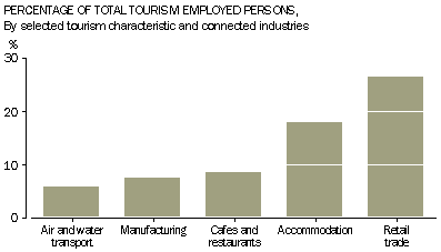 Tourism activity is widespread, with nearly all of the broad industry groups involved to a greater or lesser extent in providing goods and services to visitors. The Air and Water Transport industry was the biggest contributor to tourism gross value added (15%), followed by the Accommodation industry (11%), the Cafes, Restaurants and Takeaway Food Outlets industry (10%), and the other Retail Trade industry (9%). The importance of these four industries to tourism in 1997-98 is highlighted by their combined tourism gross value added of $9.8 billion, representing 44% of total tourism gross value added. Tourism is Australia's fourth largest export industry, exporting $12.8 billion worth of goods and services in 1997-98 (which represented 11% of total exports). Only mining (35%), manufacturing (23%) and agriculture (20%) had greater direct export earnings in that year. Tourism consumption totalled $58.2 billion. Long distance passenger transportation represented the largest proportion of tourism consumption at 18%, with shopping, including gifts and souvenirs at 16%, takeaway and restaurant meals at 15% and accommodation services with 9%. Tourism contributes significantly to employment, with 513,000 persons in tourism generated employment in 1997-98. This represents 6% of total employed persons. The largest number of persons in tourism generated employment were in retail trade (27%), followed by accommodation (18%), and cafes and restaurants (9%). Tourism had a larger share of part-time workers (37%) than the economy wide proportion (26%) in 1997-98. In addition, tourism employment in 1997-98 was relatively evenly distributed between males and females, compared to economy wide percentages of 43% female and 57% male employed persons. There were 4.2 million short-term overseas visitor arrivals in 1997–98, of which 31% came from the north-east Asian region, 22% from Europe and the former USSR and 19% from Oceania and Antarctica. More visitors came from Japan (797,000 arrivals) than any other country. The 4.2 million short-term international visitors to Australia spent, on average, $3,946 per trip in 1997-98 (of which $3,031 was on Australian supplied goods and services). On the other hand, the 3.0 million Australian residents departing on short term overseas trips spent $4,486 per trip (of which $775 was on Australian supplied goods and services). Further details can be found in Australian National Accounts: Tourism Satellite Account, 1997-98 (Cat. No. 5249.0) available from ABS bookshops. A summary of the publication is also available on this site. Document Selection These documents will be presented in a new window.