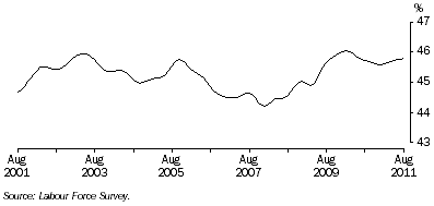 | Part-time | '000 | Trend | Aug 11 | 3 398.6 | 0.5 | 1.2 |