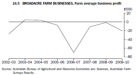 For the broadacre industries, rate of return (excluding capital appreciation) averaged 0.5% per farm in 2009–10 (graph 16.6), down from 1.0% in 2008–09.