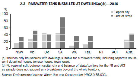 Areas outside capital cities continued to have a higher proportion of dwellings with rainwater tanks (43% compared with 26% in capital cities in 2010) (graph 2.3). Nearly nine out of ten (89%) households outside the capital city in South Australia had a rainwater tank installed. Adelaide (45% of households) and Brisbane (43%) were the capital cities with the highest proportion of households with rainwater tanks.