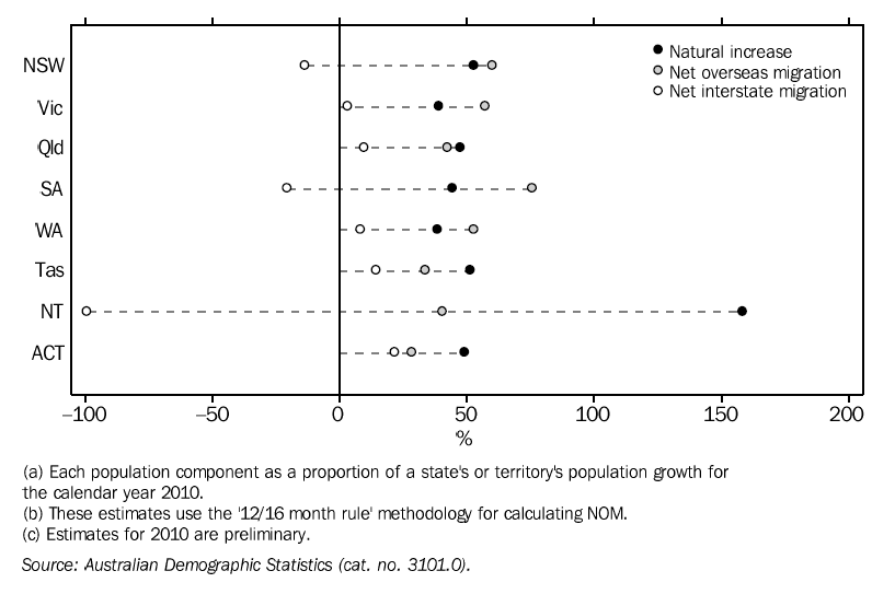 While all states and territories experienced positive NOM in 2010, it was the main component of population growth in SA (76%), NSW (60%), Victoria (57%), and WA (53%).