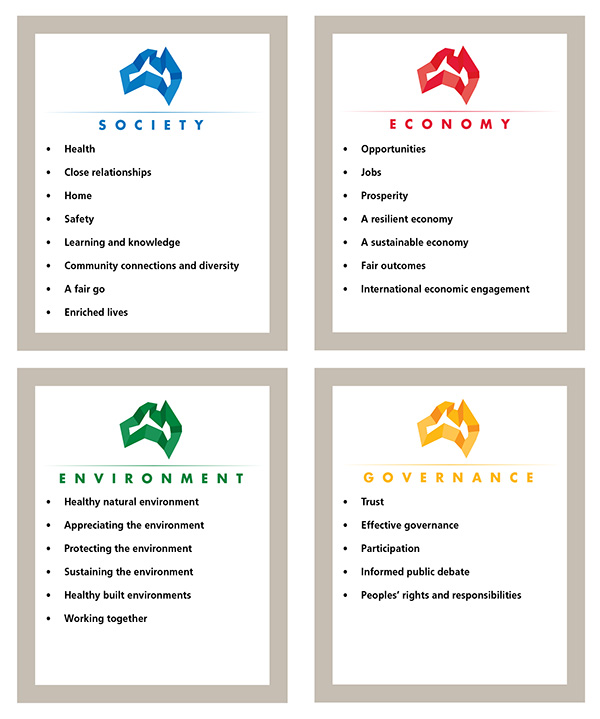 The resulting MAP framework articulates the central concepts in four domains: Society, Economy, Environment and Governance. Under each of these domains sit the relevant aspirations, themes and elements that emerge from them. Figure 1 shows the domains and summarised aspirations (i.e. themes) Australians thought important for national progress.