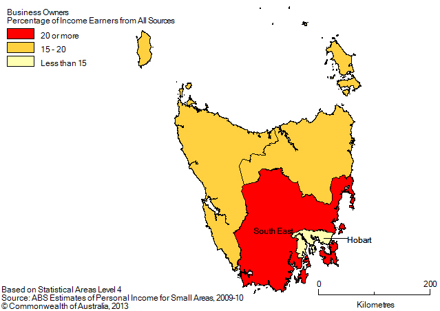 In 2009-2010, business owners represented between 14% and 24% of income earners in SA4s in Tasmania. South East had the highest proportion of business owners with 24%, while Hobart had the lowest with 14%.