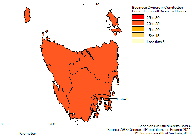 In 2011, between 20% and 24% of business owners in SA4s in Tasmania worked in the construction industry. Hobart had the highest proportion of business ownership in construction, with 24%. In all of the SA4s in the rest of Tasmania, 20% of business owners worked in construction.