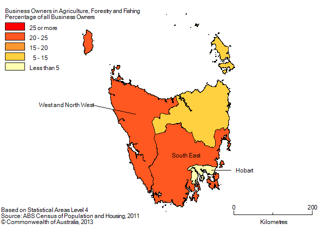 In 2011, between 3% and 20% of business owners in SA4s in Tasmania worked in agriculture, forestry and fishing. Business ownership in agriculture, forestry and fishing was highest in South East and West and North West, with 20%, and lowest in Hobart, with 3%.