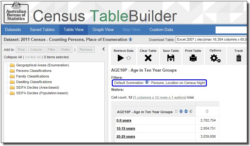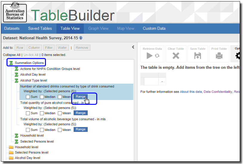 When you open a dataset and build a table, most datasets display the default summation above the table. This tells you what you are counting in your table. For example, your table may be counting persons, families, households, or motor vehicles. Some datasets also allow you to choose a summation option where you can vary what the table is counting. For example, a dataset may include options for counting number of drinks of alcohol consumed or number of kilometres travelled.
