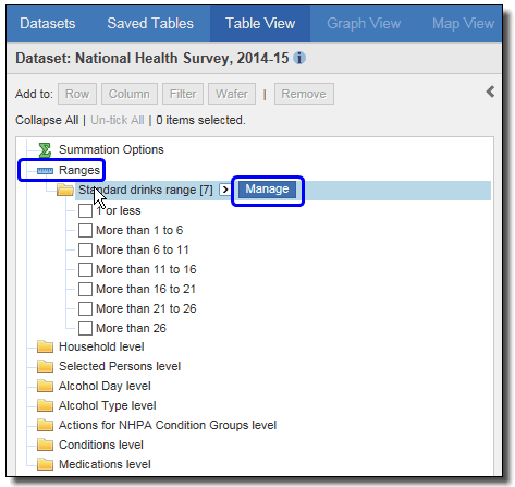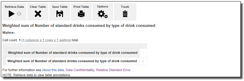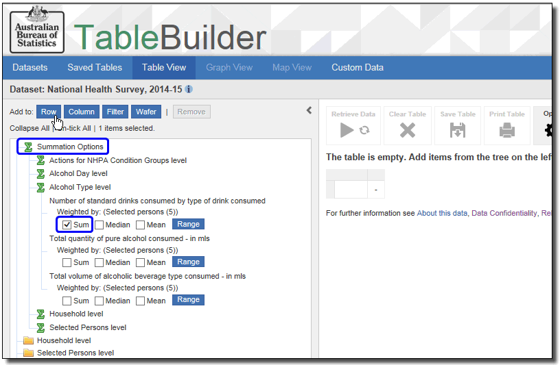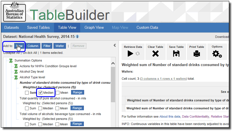6. To display the median or mean Number of standard drinks consumed instead of the sum, select the new option from the summation options on the left, and Add to row again. This automatically replaces the summation option currently in the table.