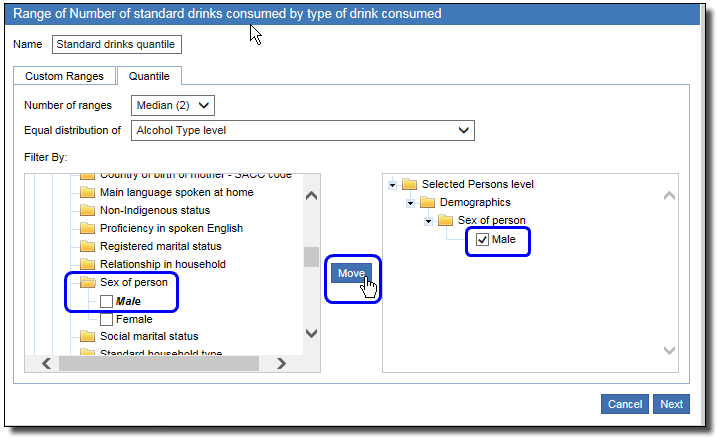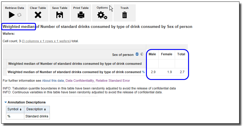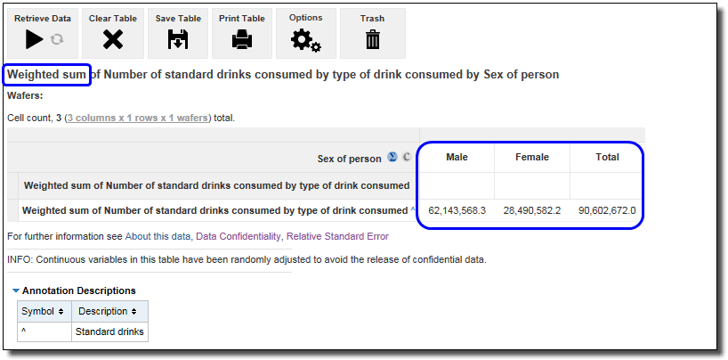 For example, instead of counting the number of males and females who consume alcohol, you can display the total number of standard drinks consumed by males and females. For survey data, this is weighted based on population estimates.