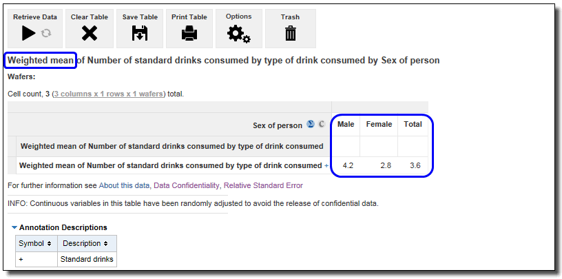 8. Similarly, when the Weighted mean Number of standard drinks by day is added to the row, it automatically replaces the median. The Weighted mean of Number of standard drinks by day was 4.7 drinks for Males, 3.1 drinks for Females and 4.0 drinks for all persons. The mean is calculated based on the population of people who have a valid response, and does not include people who do not drink or children. See Interpreting sums, means and medians for more information about valid responses for continuous variables.