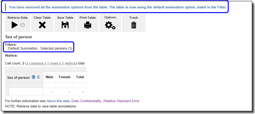 9. If all Summation Options are removed from the table, TableBuilder automatically adds in the Default summation option back into the table. If the weighted mean is removed from the above table, by dragging it into Remove, TableBuilder confirms that 'Removed all the summation options from the table. Your table is now using the default summation option, listed in the Filter'. In this case, the table has reverted to counting Selected persons.