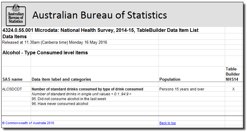 There were weighted counts of 5.8 million males and 4.5 million females whose responses were included in the sum and mean. An incorrect result would have occurred for mean if the persons who did not consume any alcohol were recorded as consuming a valid value of 0 standard drinks.