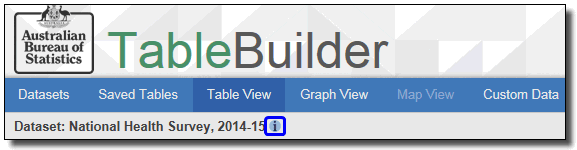 A continuous variable on a dataset has an associated range of 'valid value' responses, and also may have various categories of response that are 'special', for example a special response may be 'Not applicable' or 'Not stated'. These special responses may occur for a variety of reasons, such as the relevant question does not apply to certain records, or the information is unable to be determined. Read the dataset documentation and data item list for detailed information. To open the website dataset information, click the i link at the top left next to the dataset name when in Table view. This opens in a new tab so you can continue working in TableBuilder.