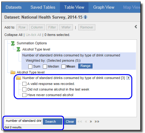 3. Using the earlier example, open the National Health Survey, 2017-18 dataset and search for Number of standard drinks consumed using the search box in the lower left corner. This finds two results in the variables list.