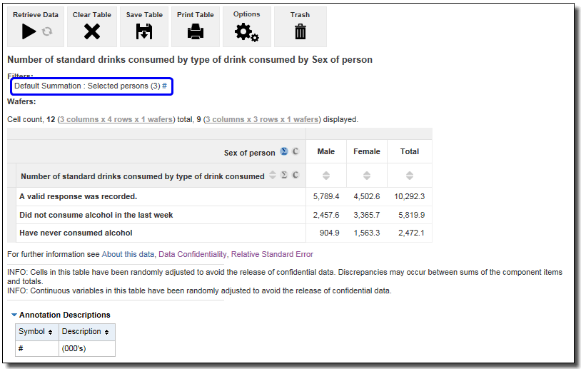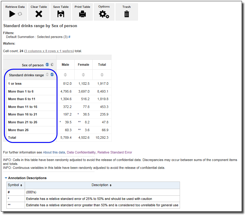 4. If a table is created using Sex and the categorical version of Number of standard drinks consumed, the weighted number of persons whose responses contributed to the sum and mean are displayed. This table is now counting persons in thousands (000's). The categorical variable for Number of standard drinks consumed provides estimates of the size of the population to which the above sum, median and mean are calculated. It also provides the sizes of the populations to which it does not apply, for example, the category 'Have never consumed alcohol', which also includes people under the age of 15 years.