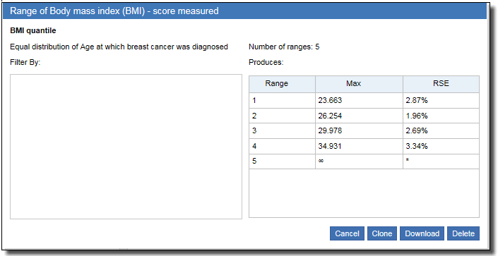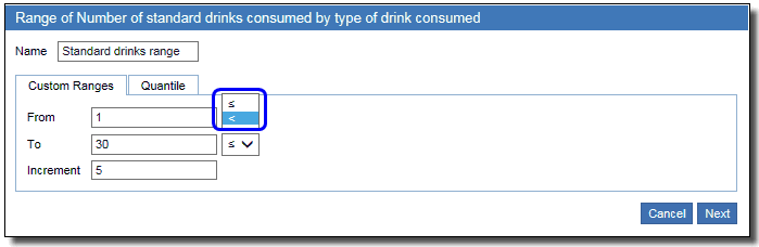 - When selecting the From and To values, select less than \(<\) or less than or equal to \(\le\) in the drop-down menu to choose whether to include the lower boundary or upper boundary in each range.