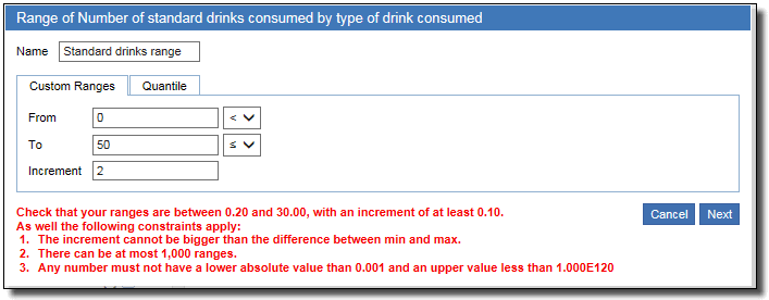 3. If values are selected outside the allowable range values, TableBuilder displays information about the minimums and maximums you can select. You can use this information to help you decide on appropriate range parameters. Click Next.