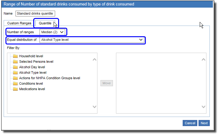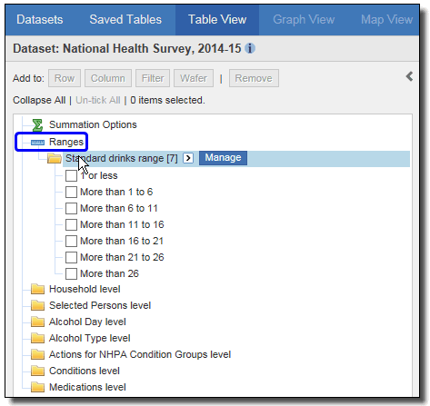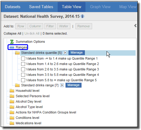 5. This creates your range, and adds it to a new Ranges folder in the variables list panel in the Table View below the Summation options folder. Click on the Ranges folder to view your range. The Ranges variable is now saved and can be used to a table now or for future tables using this dataset.