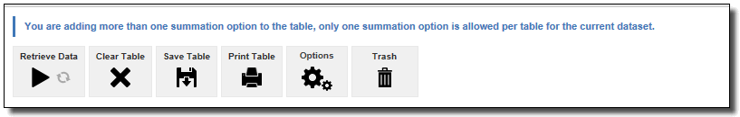 - If you try to add more than one summation at the same time by ticking more than one of sum, median or mean, TableBuilder displays a error message "Only one summation option can be added to a table"