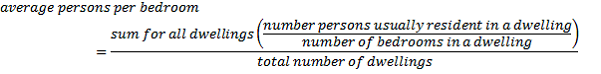 The method used to calculate the average number of persons per bedroom for the 2016 Census is summarised in the following equation. This method produces a representative dwelling based measure: