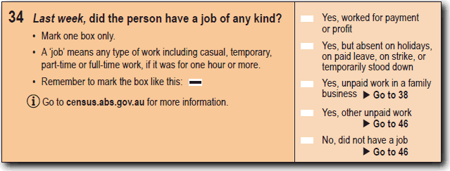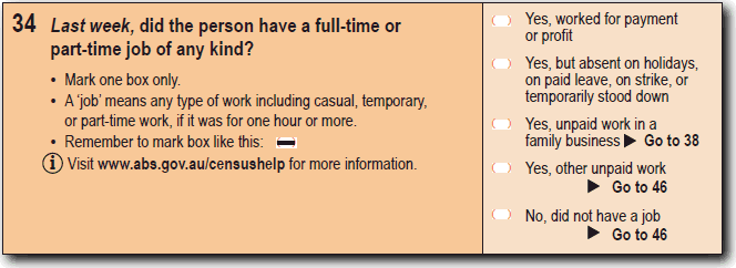 Labour Force Status is derived from responses to a number of questions on the Census form. Data is captured automatically from four mark box responses and from the written numeric response from the question asking how many hours a person worked. Occupation information may sometimes be used. Images of these questions are provided below.