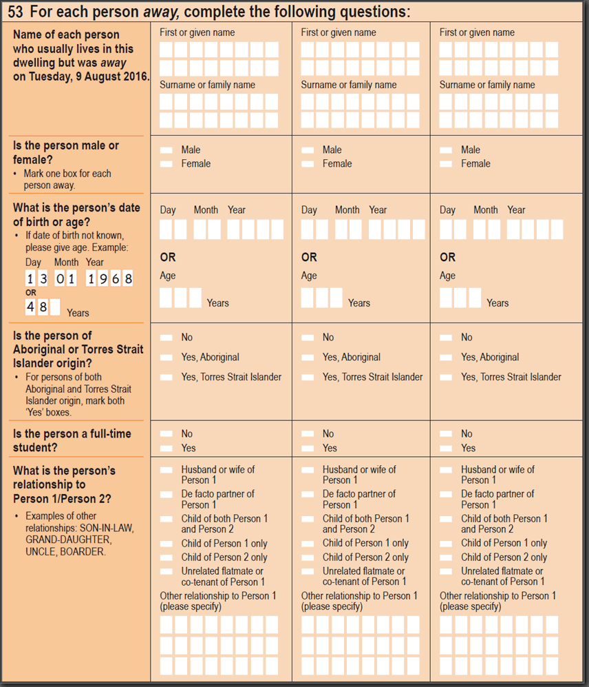 Questions 5 and 53 as they appeared on the 2016 Census Household Paper Form: