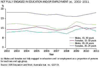 COMMENTARY YOUNG PEOPLE NOT FULLY ENGAGED IN EDUCATION AND/OR EMPLOYMENT In 2011, the majority of males and females aged 15-19 years were fully engaged in education and/ or employment, but a small proportion of males (13%) and females (16%) were not engaged. The proportions of males and females not fully engaged in education and/or employment were higher for the 20-24 year age group than for the 15-19 year age group, with a higher proportion of females (27%) in this age group not being fully engaged in education and/or employment than of males (18%). Levels of participation in education and the labour market are frequently used indicators of the wellbeing of young people. Research suggests that young people who are not fully engaged in education or employment (or a combination of both) are at greater risk of unemployment, cycles of low pay, and employment insecurity in the longer term. Participation in education and training, and engaging in employment, are considered important aspects of developing individual capability and building a socially inclusive society. (Endnote 1) Over the last decade (2002-2011), the proportion of 15-19 year old males and females not fully engaged in education and/or employment has remained relatively stable, except in 2009 where there was an increase of between 3 and 4 percentage points respectively. This reflected the change in market circumstances at that time. (Endnote 1) It is not surprising that the proportions of males and females not fully engaged in education and/or employment were lower in the 15-19 year age group than in the 20-24 year age group as the majority of those aged 15-19 years were still attending school. In 2011, there were a greater proportion of 20-24 year old females (27%) not fully engaged in education and/or employment compared to males (18%). Differences in non-engagement between males and females at this age may, in part, be a reflection of the greater likelihood of females being a carer of young children. (Endnote 1) However, a higher proportion of not fully engaged males in this age group (56%) neither worked nor studied compared to females (48%). Rates of part-time study in this age group were higher for not fully engaged females (7%) compared to males (2%). Similar proportions of not fully engaged 20-24 year old males (41%) and females (45%) undertook part-time work only. (Endnote 2) Aboriginal and Torres Strait Islander peoples Aboriginal and Torres Strait Islander Australians aged 15-19 years were more likely to not be fully engaged in education and/or employment, compared to the total population aged 15-19 years. In 2008, about one-third of young Aboriginal and Torres Strait Islander males and females aged 15-19 years were not fully engaged. The proportions of young Aboriginal and Torres Strait Islander males and females aged 15-19 years who were not fully engaged declined from 39% of males and 47% of females in 2002, to 31% of males and 35% of females in 2008. Compared to 15-19 year olds, there were higher proportions of young Aboriginal and Torres Strait Islander males and females in the 20-24 year age group who were not fully engaged. In 2008, over half of Aboriginal and Torres Strait Islander peoples aged 20-24 years were not fully engaged. A higher proportion of Aboriginal and Torres Strait Islander females (73%) were not engaged compared to Aboriginal and Torres Strait Islander males (53%). ENDNOTES 1. Australian Bureau of Statistics, March 2010, Australian Social Trends, Mar 2010, (cat. no. 4102.0) <www.abs.gov.au>. 2. Australian Bureau of Statistics, Data available on request, Survey of Education and Work, 2011. EDUCATION LINKS Glossary Data Cubes Document Selection These documents will be presented in a new window.
