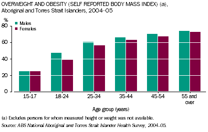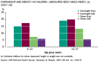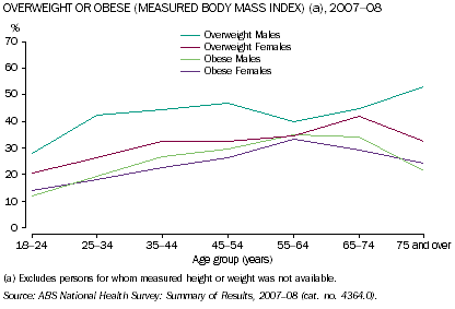 COMMENTARY OVERWEIGHT AND OBESITY In 2007-08, a higher proportion of males aged 18 years and over were overweight or obese (63%) than were females (48%). These overweight/obesity rates were both up five percentage points on the 2001 results. These estimates are based on people's self reported height and weight. People being overweight or obese may have significant health, social and economic impacts, and is closely related to lack of exercise and to diet. Being overweight or obese increases the risk of suffering from a range of health conditions, including coronary heart disease, Type 2 diabetes, some cancers, knee and hip problems, and sleep apnoea. (Endnote 1) In 2008, the total annual cost of obesity to Australia, including health system costs, loss of productivity costs and carers' costs, was estimated at around $58 billion. (Endnote 2) While genetics may play a role in a person's propensity to become overweight or obese, the fundamental cause is an imbalance between energy consumed and energy expended. Shifts towards energy-dense diets and decreasing physical activity are two of the factors that have contributed to increases in rates of overweight and obesity. (Endnote 3) Over the last two decades, there has been a steady shift in the Australian population towards the higher end of the Body Mass Index (BMI), driven mainly by weight gain rather than by changes in height. The BMI, a simple index of weight for height, is commonly used to classify people as overweight and obese. It is defined as the weight in kilograms divided by the square of the height in metres (kg/m2). By age In general, rates of overweight/obesity are higher in older age groups, although males and females in the oldest age group (75 years and over) had lower rates. Adult male overweight/obesity rates are higher than female rates across all age groups. In 2007-08, 73% of males in the 65-74 year age group were overweight or obese compared to 39% in the 18-24 year age group. There has been a 10 percentage point increase in the 65-74 year age group male overweight/obesity rate since 2001 when 63% of males in this age group were overweight or obese. The highest overweight/obesity rate for females in 2007-08 was in the 55-64 year age group (61%), while the lowest rate was in the 18-24 year age group (29%). Since 2001 the proportion of females who were overweight or obese increased for all age groups, with the highest increases occurring in the 18-24, 25-34 and 35-44 year age groups (each up by seven percentage points). Measured Body Mass Index In the 2007-08 National Health Survey (NHS), the measured height and weight of respondents was collected in addition to their self reported information. Based on measured data, 68% of males and 55% of females aged 18 years and over were either overweight or obese (compared to rates of 63% and 48% based the self reported height/weight). Males and females had similar rates of obesity (26% and 24% respectively), but a higher proportion of males (42%) were overweight than were females (31%). This result may be influenced by the fact that males generally have more muscle mass than females. For males and for females the 65-74 years age group recorded the highest rates of overweight/obesity (79% and 71% respectively). Measured BMI data from the 2007-08 NHS may be compared with measured BMI data from the 1995 National Nutrition Survey to see how the overweight/obesity rates have changed over the that time. While the proportion of males who were overweight or obese has increased by four percentage points, it has increased by six percentage points for females. These increases have been more at the obese end of the BMI scale, with obesity rates increasing by seven percentage points for males and five percentage points for females over this period. While being overweight or obese is more prevalent in middle to late adulthood, Australia's increasing obesity is evident in the large numbers of younger people who are now overweight or obese. In 2007-08, 62% of males and 44% of females aged 25-34 years were overweight or obese. Overweight and obesity in children Overweight and obesity in children is a major health concern. Studies have shown that once children become obese they are more likely to stay obese into adulthood and have an increased risk of developing both short and long-term health conditions, such as Type 2 diabetes and cardiovascular disease. (Endnote 4) In 2007-08, a quarter of all Australian children aged 5-17 years, were overweight or obese. This was up four percentage points from 21% in 1995. The proportions of boys and girls who were overweight or obese were similar (26% and 24% respectively). Between 1995 and 2007-08, there was no change in the proportion of boys who were overweight (16%) but the proportion of boys who were obese almost doubled from 5% in 1995 to 9% in 2007-08. The increase in the proportion of boys who were obese was higher in the 13-17 year age group (up seven percentage points) compared to the 5-12 year age group (up four percentage points). The obesity rate for girls aged 5-17 years remained unchanged at 6% during this period, while the proportion of girls who were overweight increased by three percentage points. The increase in the proportion of girls who were overweight occurred for older girls only (13-17 years), up from 12% in 1995 to 20% in 2007-08. Overweight and obesity in Aboriginal and Torres Strait Islander peoples In 2004-05, 62% of Aboriginal and Torres Strait Islander males and 58% of Aboriginal and Torres Strait Islander females aged 18 years and over were overweight or obese. For both Aboriginal and Torres Strait Islander males and females, the rates for overweight/obesity were higher in older age groups, with nearly three quarters of both the male and female populations aged 55 years and over being overweight or obese.