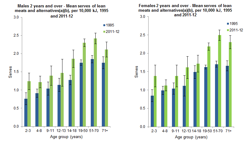 In 2011-12, the average daily consumption of foods from the lean meat1 and poultry, fish, eggs, tofu, nuts and seeds and legumes/beans group was 2.1 serves per 10,000 kJ, an increase of 36% on the 1995 average of 1.6 serves per 10,000 kJ. The increase occurred in each age and sex group, although the largest increase was seen among women aged 51-70 years, whose average serves per 10,000 kJ, increased from 1.7 to 2.5, making them the highest consumers of this food group on a per kJ basis.