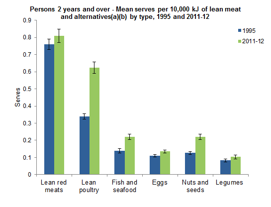 Around half of the increase in the lean meat and poultry, fish, eggs, tofu, nuts and seeds and legumes/beans has come from an increase in lean poultry consumption which almost doubled (from 0.34 to 0.62 serves per 10,000 kJ), to make up 29% of the group in 2011-12 (up from 22% in 1995). While consumption of lean red meat also increased (from 0.77 to 0.81 serves per 10,000 kJ), as a share of the overall group it dropped from 49% in 1995 to 38% in 2011-12 due to greater increases in consumption in the other food groups (as well as poultry). These included fish and seafood (up from 0.13 serves to 0.21 serves per 10,000 kJ over the 1995 to 2011-12 period), nuts and seeds (from 0.14 to 0.24 serves per 10,000 kJ), eggs (0.10 to 0.13 serves per 10,000 kJ) and legumes (0.08 to 0.10 serves per 10,000 kJ).