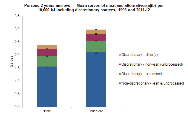 The proportion of all serves of meats, poultry, fish, eggs, nuts, seeds and legumes consumed that were defined as “discretionary” decreased from 36% in 1995 to 31% in 2011-12. The discretionary balance comprises processed meats (such as bacon, ham and salami), non-lean meats (>10% total fat) and lean meats that were contained within a discretionary food (e.g. chicken pie, battered deep fried fish etc). The average consumption of processed meat and non-lean meat was similar in both 1995 and 2011-12 (0.68 and 0.70 serves per 10,000 kJ respectively), but as a share of the total meats and alternatives food group, the non-lean and processed meats fell from to 29% to 25% due to the increased consumption of the non-discretionary forms.